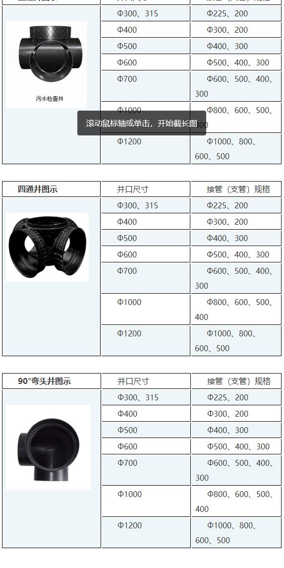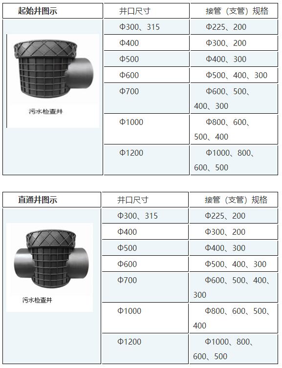 塑料檢查井可以分為起始井、直通井、三通井、四通井、90°彎頭井,如果是要進行污水處理,那么需要增加沉泥槽,以方面把污水中泥土等雜質(zhì)聚集起來進行處理。以龍康的塑料檢查井為例,具體的規(guī)格如下: